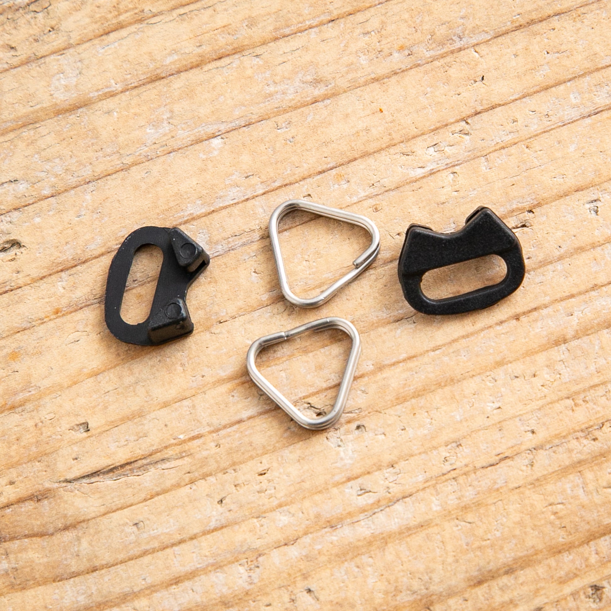 樹脂製のガードが付属した、三角形の二重カンの1セット(2つ)を商品に同封いたします。